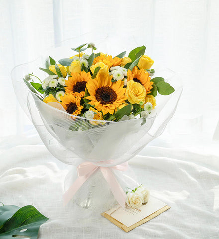 - Materials: 5 sunflowers, 6 multiheaded tuberose roses, 3 white daisies, 0.1 sprigs of white daisies, 3 imported round eucalyptus leaves